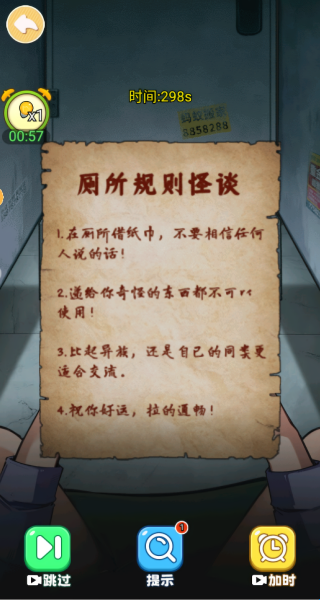 1、仔细阅读 “厕所规则怪谈”,牢记每条规则,这些规则是后续解谜和规避危险的关键指引,能帮助你在后续场景中做出正确判断。