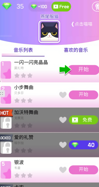 1、在音乐列表中,选择想要演奏的乐曲,点击对应的 “开始”按钮。进入游戏后,跟随音乐节奏,精准点击下落的猫咪方块,享受音乐演奏的同时获取分数。