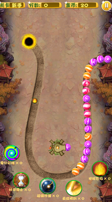 2、彩球精准发射,观察球链颜色排列,操控炮台调整角度,发射彩球。对准相同颜色球,使3个及以上相连,触发消除效果,规划发射路径。