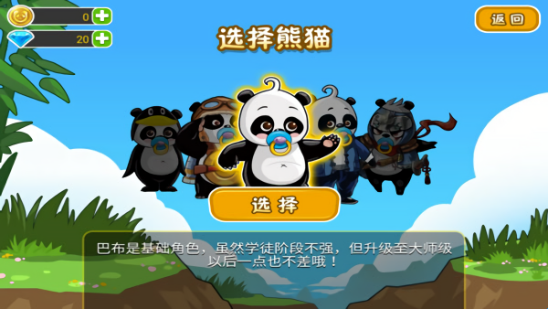 1、游戏中的熊猫将不再是单一的角色,会有更多的游戏角色供玩家选择,玩家可以通过游戏闯关获得经验金币将每一只熊猫都升级为大师
