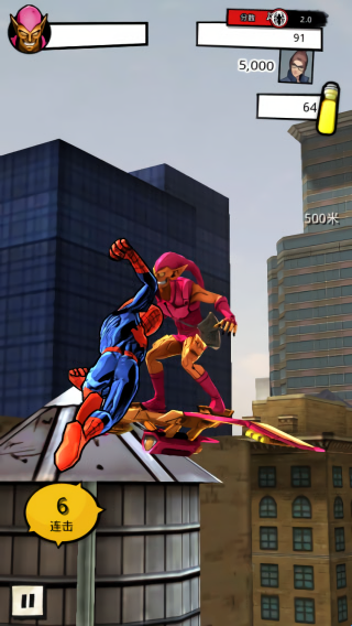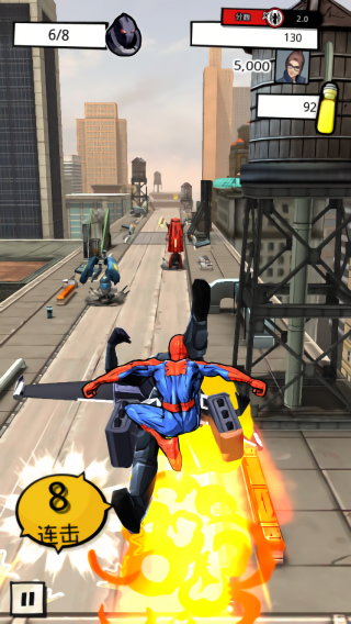 2、独特的游戏设置,非一般的跑酷游戏!和超级反派战斗,使用蛛丝飞荡、攀爬墙壁、完成高空跳跃!