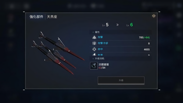 5、接下来我们回到前一个画面,选择"升级"的功能,这是升级"船体"的功能,同时可以提升舰体值、护甲、护盾,是非常划算的升级。需要的材料是"立方纤维",这东西获得的方式就是黑市抽奖,或是去打"星际探索"。