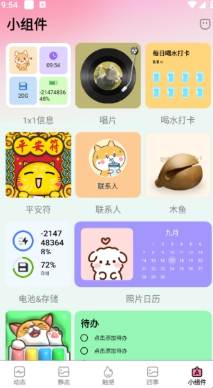 4、在小组件页面中有唱片、喝水打卡、平安符、联系人、木鱼、照片日历等内容。