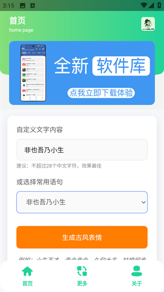 古风小生表情制作软件,顾名思义,该软件专注于提供表情包制作服务,操作非常简单哦,大家只需输入关键字,软件就能为大家智能生成相关的表情包,都是以古风为主,当然,表情包的文字、背景等内容支持大家自定义,还能一键保存为GIF或PNG格式。