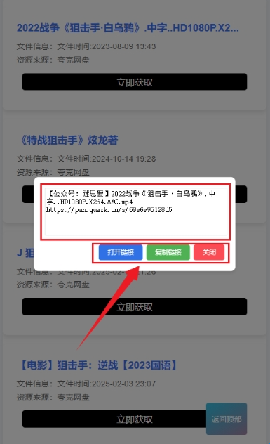 5、然后点击【立即获取】就能获取资源链接,这里大家可以选择复制链接,打开链接。