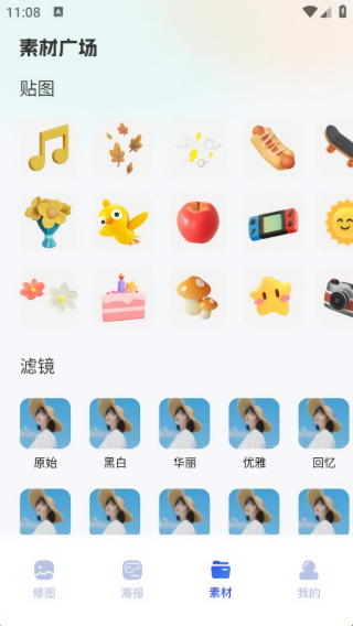 “素材广场”风格多样,贴纸包含“美式WOW”“漫画边框”等,增添趣味;滤镜打造不同氛围;背景丰富画面选择。