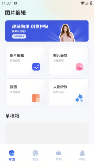 拥有“图片编辑”功能,可快速修图,调整色彩、对比度等基础参数;“照片美颜”实现人像美容,磨皮、瘦脸等功能让颜值更出众;“人物特效”带来新奇玩法,为人物添加独特效果。