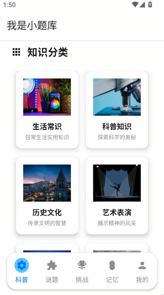 想提高自己的知识储备?可以试试我是小题库软件!里面为大家带来了各种各样的知识哦,涉及生活常识、科普知识等,大家可自由选择进行学习,还能参加各种答题挑战,让学习变得更加有趣,完成任务可领取丰厚的奖励,轻松积累知识。