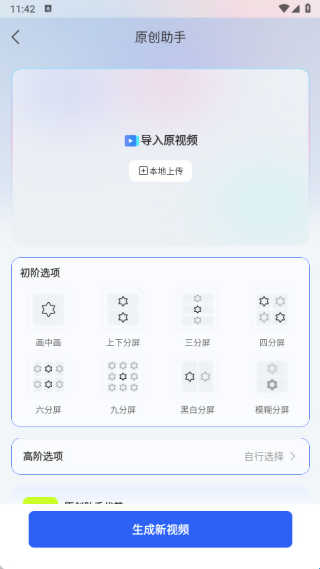2、点击原创助手按钮,然后导入原视频,选择初阶选项、高阶选项,了解原创助手优势,再生成新视频;