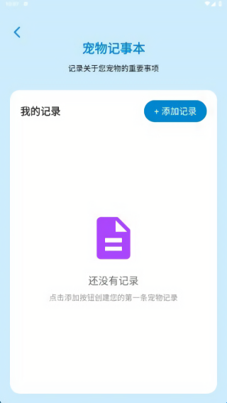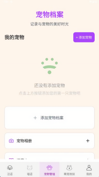 1、在app的宠物管理页面,带来了档案添加、相册、记事本等功能。