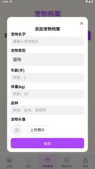 2、点击添加宠物档案功能,进入到信息存储页面,设置宠物的名字、年龄等基本资料。