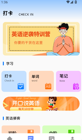 2、在软件首页界面找到底部菜单栏“打卡”功能按键点击进入下一步