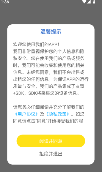 1、首先打开软件查看“温馨提示”后,点击“阅读并同意”按钮进入APP