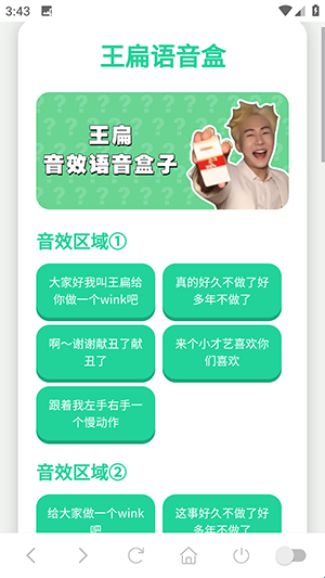王扁语音盒是一个极具特色的影音娱乐平台,里面带来了各种有趣的语音哦,都融合了一些网络热梗,大家点击感兴趣的语音就能直接播放,完全免费哦。并且该软件不需要登录注册就能直接使用,里面的语音会经常更新的,还支持开启悬浮窗。
