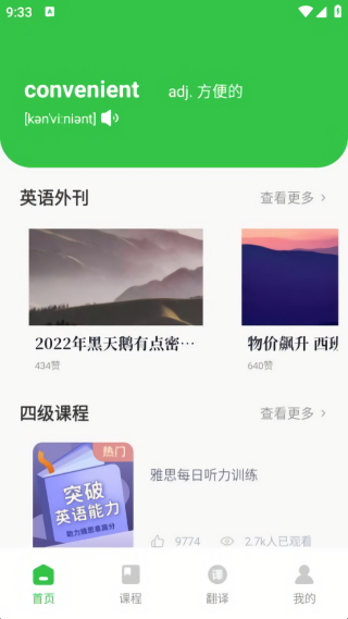 1、进入到平台首页,有英语外刊,四级课程提供,便捷选择去学习。