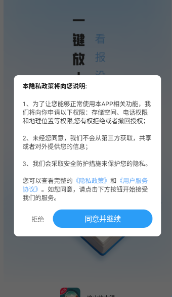 1、打开软件阅读“隐私政策和用户服务协议”点击“同意并继续”进入app