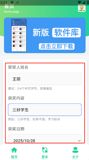 2、进入首页之后输入获奖人姓名以及获奖内容等信息。