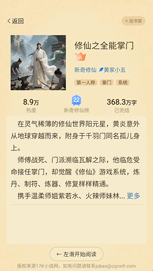 3、左滑开始阅读,右上角点击加入书架,可以保存到书架,方便下次继续阅读。