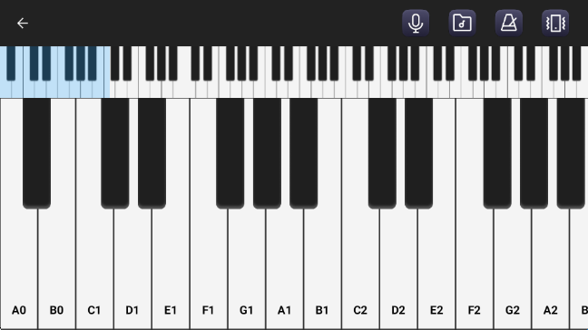 进入弹奏界面,可看到88键全仿真虚拟钢琴键盘,可左右滑动查看完整键盘,点击琴键即可模拟弹奏,界面上方还有麦克风、录制等功能按钮。