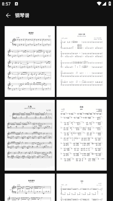 进入钢琴谱板块,可查看《致青春》《时间入流》《大鱼》《花海》等多首曲目钢琴谱,辅助曲目练习。
