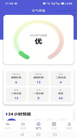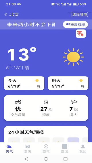1、安装进入app,能在天气页面查看到本地温度、空气质量等气象数据。