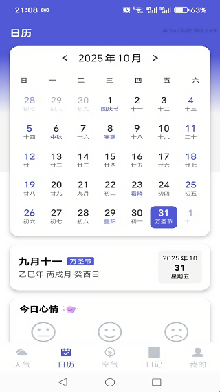 2、在日历页面,一键查看每天宜忌事项,同步添加今日心情信息。