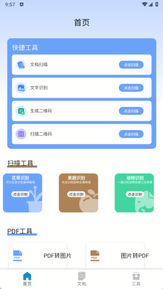 1、在首页中提供文档扫描、文字识别、生成二维码、扫描二维码的快捷工具,还有花草识别、果蔬识别和动物识别的扫描工具,同时还有pdf工具;