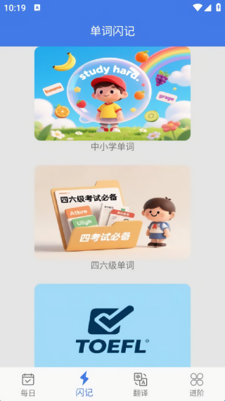 单词闪记背单词软件,这是一个全新上线的学习软件,这里提供的单词库非常全面,支持根据不同用户的情况制定专属的学习计划,让你背单词更有效,还能抗遗忘哦,不用担心背了就忘。除此以外,这里还有强大的翻译功能提供,满足不同用户的需求。