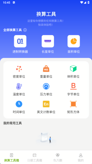 慧效工具箱,这是一个手机多功能工具箱软件,这里有非常丰富的工具等你体验,分类详细,包括换算工具、日期工具等,用户们选择需要的工具可直接使用哦,完全免费无限制。该软件的界面是非常简洁清爽的,使用期间无广告打扰哦!
