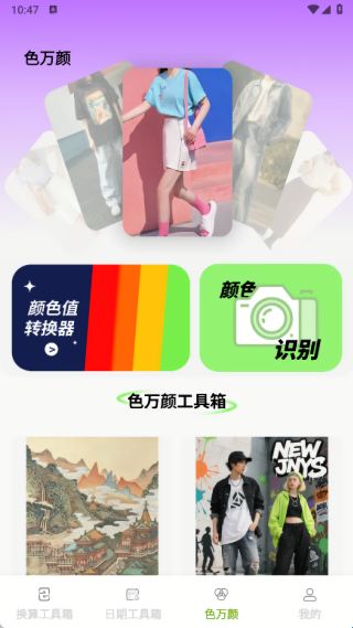 4、在色万颜页面中有颜色值转换器、颜色识别两种功能,同时还有色万颜工具箱。