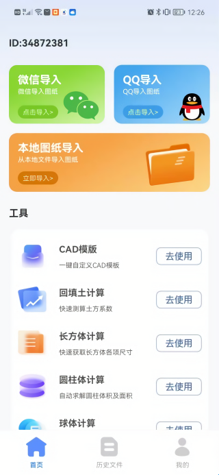 1、在首页中支持微信导入、QQ导入以及本地图纸导入功能,还有CAD模版、回填土计算、长方体计算、圆柱体计算和球体计算功能。