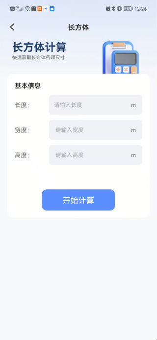 3、在长方体计算页面中输入长度、宽度和高度,然后点击开始计算即可;
