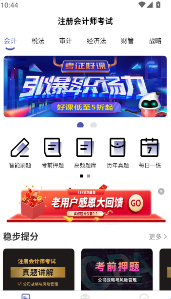 欢迎体验注会考试提分王app!这是一个备考神器,主要针对的是注会考试,这里提供的备考资源非常全面哦,无论是考试题库还是公开课程都一应俱全,大家可以随时随地前来学习刷题,并且这里的题目都配备详细的解析哦,让你一举提供考试。