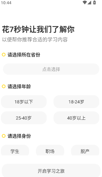 3、之后进入基础信息填写界面,输入完成后点击“开启学习之旅”进入下一步